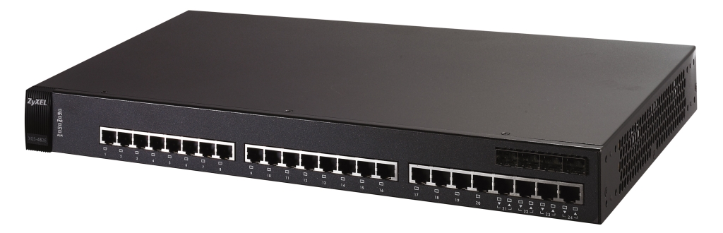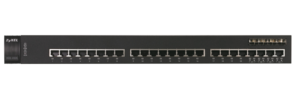 Комутатор, ZyXEL XGS-4526, 24-port Managed Layer3+ Gigabit switch, 20x metal + 4x Gigabit dual personality ports (RJ45 or open SFP) + 2x 10Gbit XFP slot (option EM-422 modul)