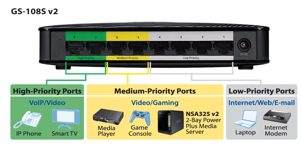 Commutator/ Switch, ZyXEL GS-108Sv2 8-port 10/100/1000Mbps Gigabit Ethernet switch, 4 QoS ports (2port "High", 2ports "Middle"), 802.3az (Green), desktop, plastic housing