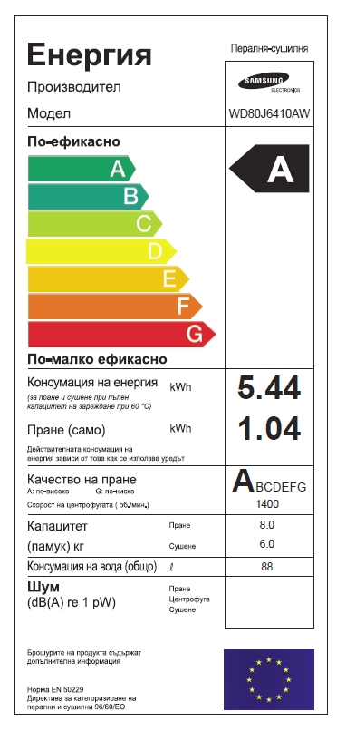 | Консумация на енергия, kWh | Wash: 208 kWh / annum, Wash and Dry: 1 088 kWh / annum |