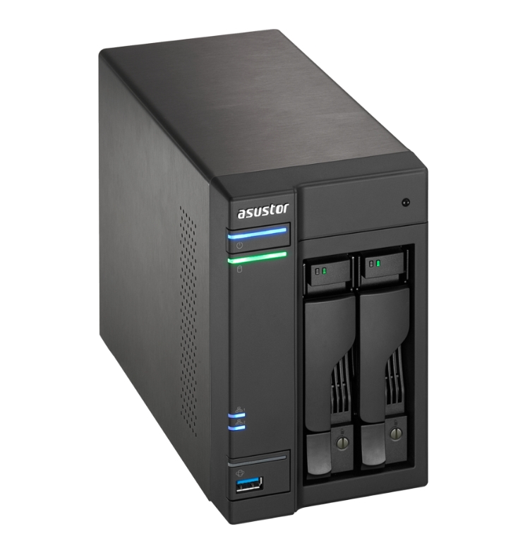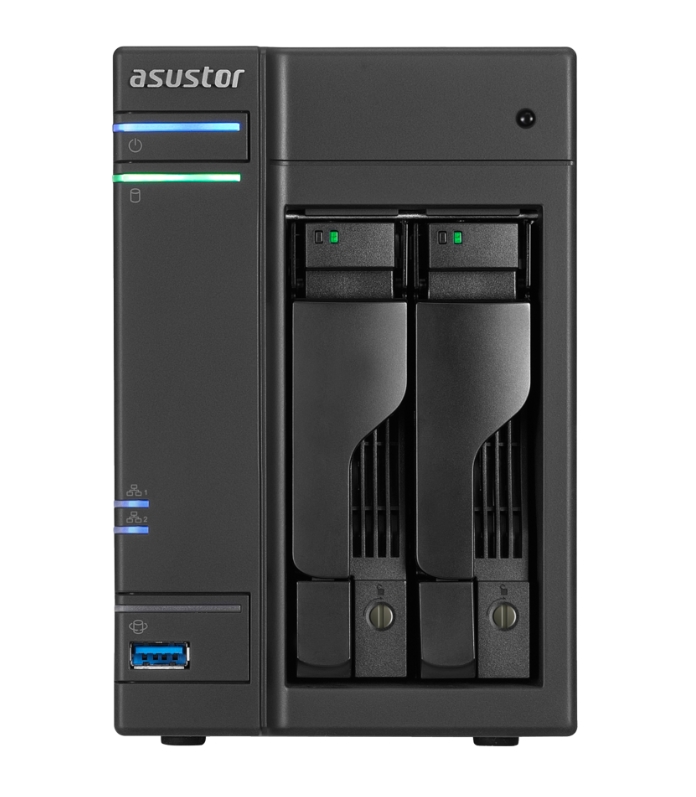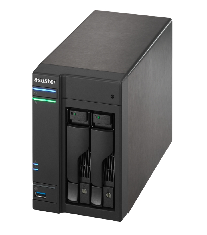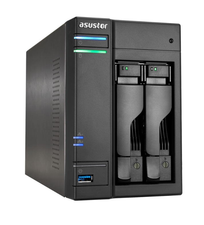 Мрежов сторидж, Asustor AS6202T, 2-bay NAS, Intel Celeron Quad-Core N3150 ( up to 2.08GHz), 4 GB DDR3L SO-DIMM (max 8GB), 2 x 3.5" or SSD, GbE x 2, 3*USB 3.0 ,2*USB 2.0, 2*eSATA, 16 Ch. IP Cam(4 license incl.), WoL, HDMI+ S/PDIF+ IR Receiver, AES-NI hardw encr, lock.