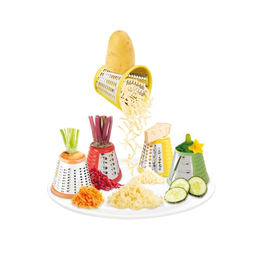 | Благодарение на 5-те си приставки, Fresh Express + Ви позволява да режете и настъргвате на едро и дребно зеленчуци, плодове, сирене или шоколад директно в съда, в който ще ги сервирате! Конусите са кодирани по цвят, за да можете да изберете точно този, който Ви е необходим в момента. Освен това добавят щипка цвят в кухнята Ви. Fresh Express + е с голям подаващ отвор, което ви освобождава от рязането на зеленчуците предварително!Fresh Express + прави по-лесно постижими необходимите Ви 5 хранения на ден! |