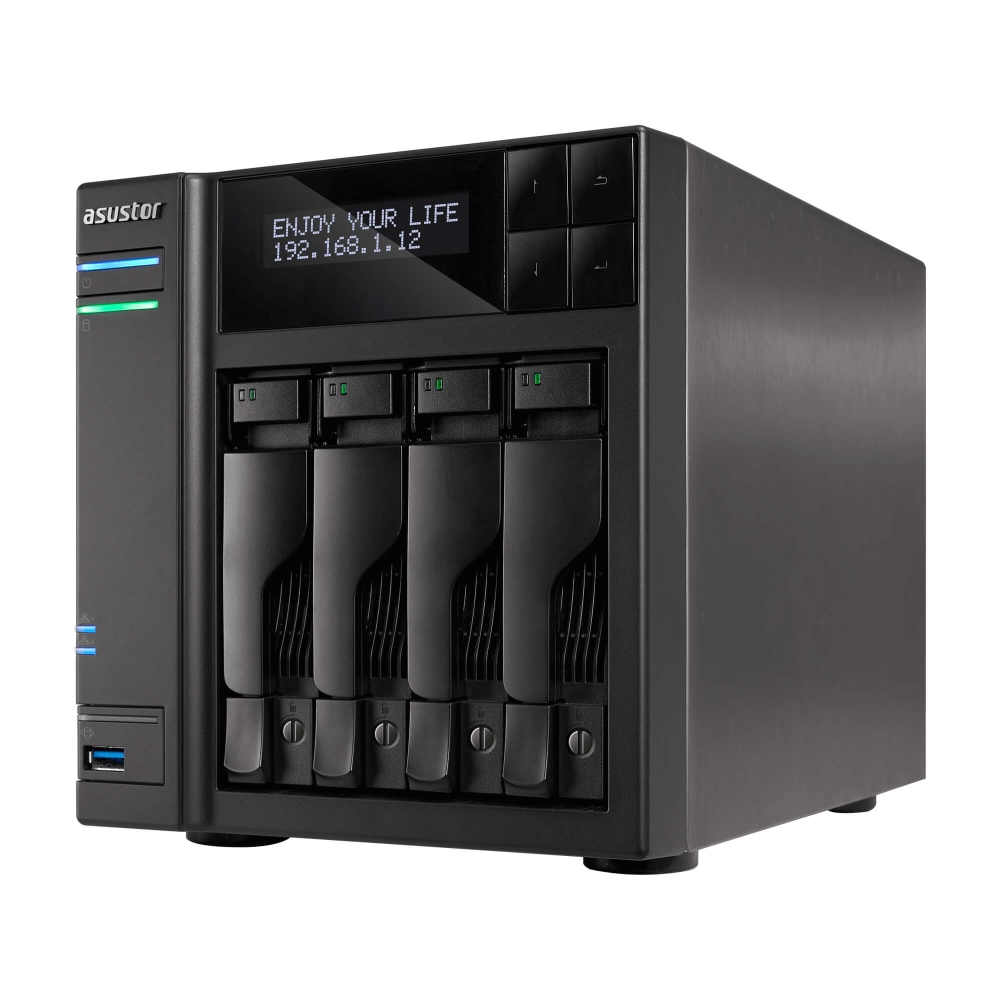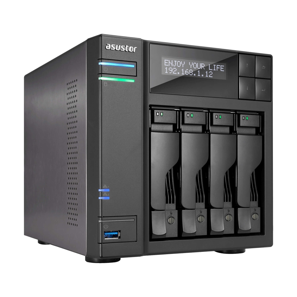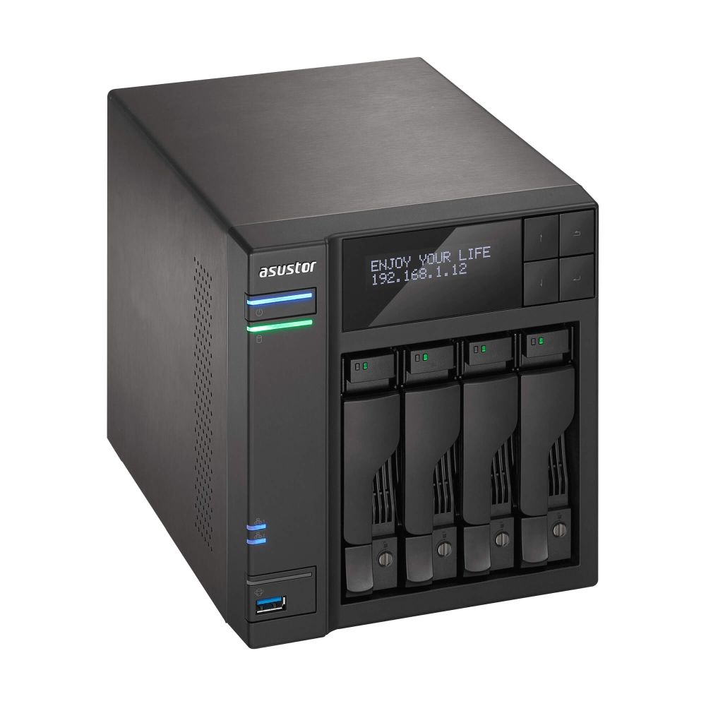 Мрежов сторидж, Asustor AS6404T, 4-Bay NAS, Intel Apollo Lake Quad-Core Intel J3455 up to 2.3 GHz, 8 GB SO-DIMM DDR3L, GbE x 2, USB 3.0 x 4 (Type A x3, Type C x1), WOW (Wake on WAN), WOL, System Sleep Mode, AES-NI hardware encryption, with lockable tray