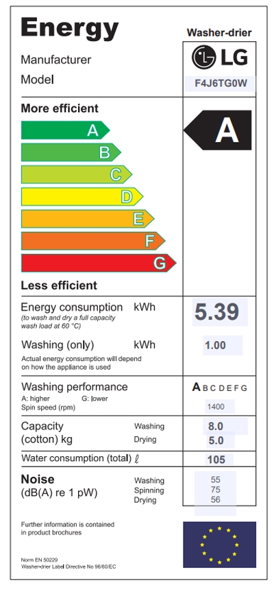 | Консумация на енергия, kWh | Wash and dry: 5.44 kWh / cycle, Washing(Only): 1.04 kWh |
