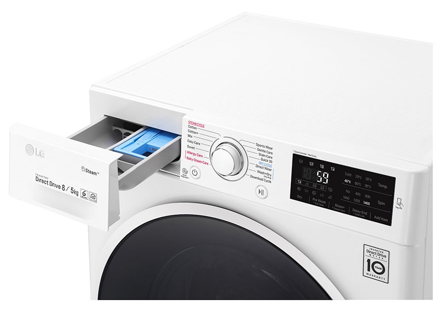 | Цикълът Allergy Care използва вода и топлина, за да създаде пяна, която дезинфекцира дрехите, като едновременно с това им осигурява деликатно третиране. Това намалява с 99,9% алергените, като домашните акари, причиняващи алергия или дихателни проблеми. Подобрете качеството на живота си, като поддържате здравословна среда без алергени. Ако сте пропуснали да поставите нещо за пране в пералнята, трябва само да натиснете „Add Item“ и да добавите нещо към прането – от чорап до голямо яке. Cotton (Памук), Mix (Смесено), Easy Care (Лесна грижа), Speed14 (Скорост14) – каквото и да сте избрали, можете да отворите* вратата веднага (след по-малко от 3 сек) по време на прането. Изберете програма за пране и технологията 6 Motion Direct Drive ще движи барабана в различни посоки, за да предостави на тъканите подходящата грижа и да постигне изключителна чистота на дрехите. Инверторният мотор с директно задвижване, с който работят нашите перални машини е изключително надежден и тих. От изтеглянето на допълнителни цикли до диагностиката и решаването на проблеми – вашата пералня просто става по-интелигентна. Общувайте лесно с нея и получавайте достъп до последните иновации чрез функцията NFC Tag On. |