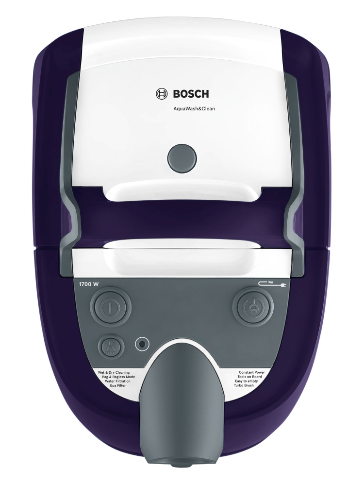Перяща прахосмукачка, Bosch BWD41740, 3in1 vacuum cleaner for dry and wet cleaning, 2,5 lt dust container, 1700 W, EPA 10 primary filter, 9 m radius, liquid pick-up nozzles, water tank: 5 l, aubergine-white-grey