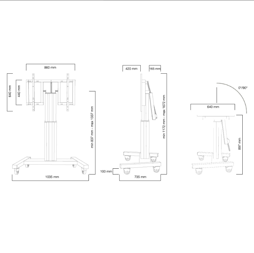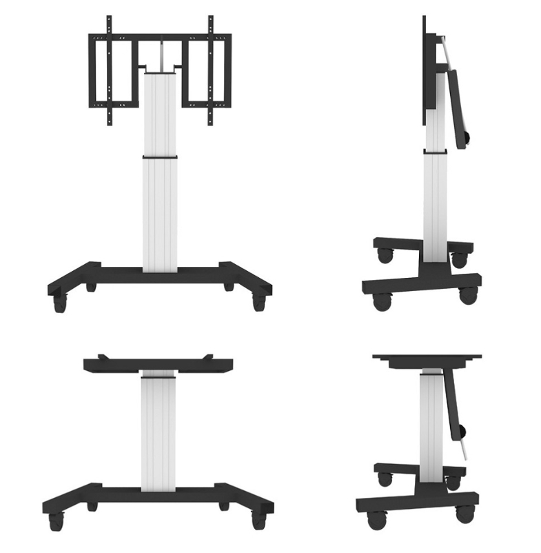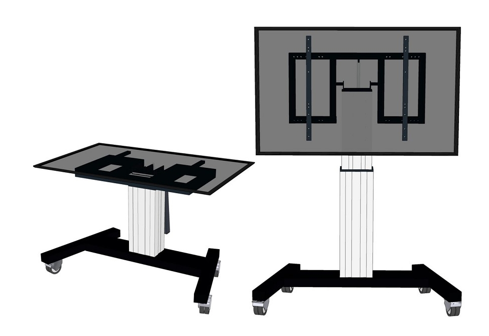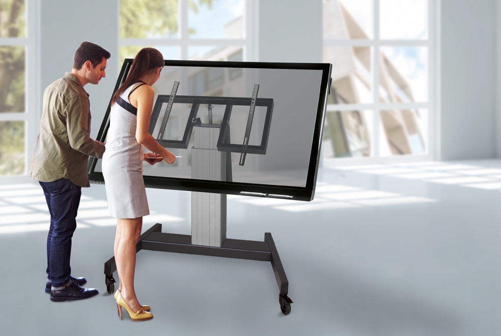 | Перфектен за използване в класна стая, заседателна зала, зала за презентации или обществен вход. Оптимално позициониране както за стояща, така и за седнала аудитория. Регулиране автоматично на височина над 50 см с дистанционно управление. От пода до центъра на екрана разстоянието варира от 89 cm до 139 cm (вертикално) и от 95 cm до 145 cm (хоризонтално). Има функция за накланяне на 90 градуса, позволяваща (сензорен) екран да се използва и в режим на маса. |