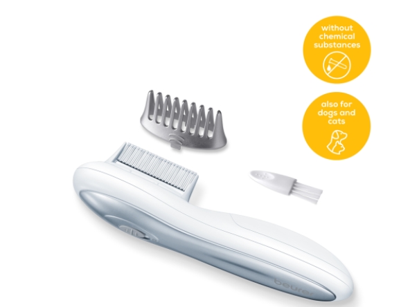 | Гребенът с HT 15 за въшки е лесен за употреба и премахва паразитите и техните гнезда от скалпа и без използването на химикали. Променя звуковия сигнал, когато влезе в контакт с въшка или козина. Включва четка за почистване и предпазна капачка. Медицинско изделие. |