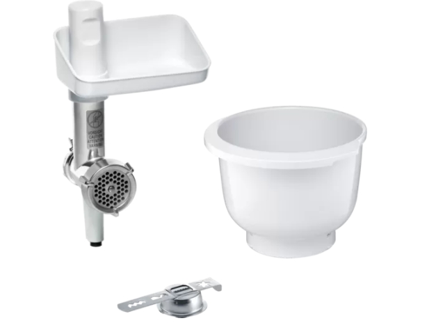 | Още приложения: месомелачка за преработка на варено или сурово месо, риба, зеленчуци и др. 4 вида сладкиши: създайте 4 различни вида сладкиши с практичната приставка. Допълнителна пластмасова купа: за гъвкаво и едновременно приготвяне на две теста, особено за тесто с мая. Лесно почистване: месомелачката и всички аксесоари се почистват лесно. Оригинални аксесоари: подходящи за кухненски машини MUM5. |