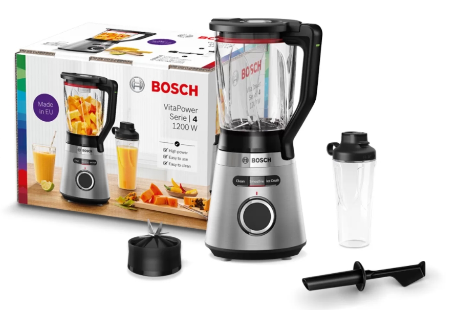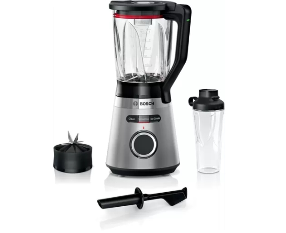 Блендер, Bosch MMB6384M Series 4, VitaPower Blender, 1200 W, Glass ThermoSafe jug 1.5 l, Tritan ToGo bottle 0.6 l, Speed adjustment and pulse function, ProEdge stainless steel blades made in Solingen, Stainless steel