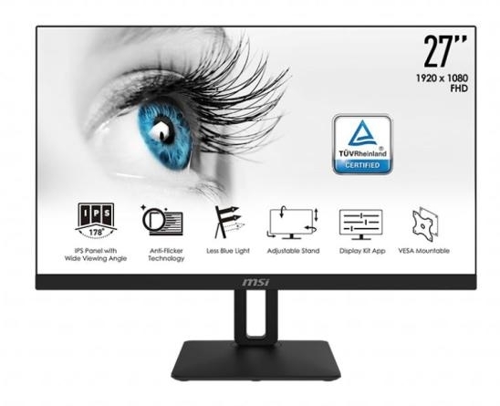 Monitor, MSI PRO MP271P, 27", IPS, 5ms, FHD 1920x1080, Exclusive Display Kit, Anti-Glare, Less Blue Light, Anti-Flicker, Speakers 2x2W, HDMI (Up to 75Hz), VGA, Mic-in, Headphone out, 1000:1, 250 cd/m2, Tilt, Heigh. Adj., VESA 100, 9S6-3PA2AT-019