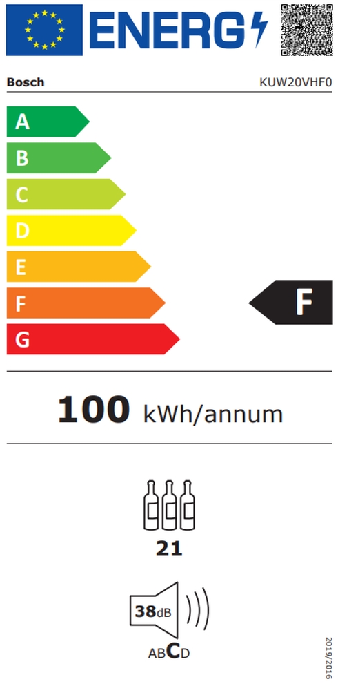 Шкаф за вино, Bosch KUW20VHF0 SER6 Wine cooler with glass door, F, 82.0 cm x 30.0 cm x 55.0 cm, Number of shelves - 4, Capacity for bottles of 750 ml - 21, Temperature range (° C) - 5-20 ° C, 38 dB (A)