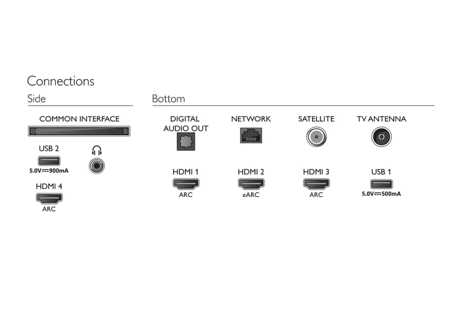 | Изводи за свързване | 4 HDMI, 2 USB, Satellite Connector, Common Interface Plus (CI+), Digital audio out (optical), Headphone out, Service connector |