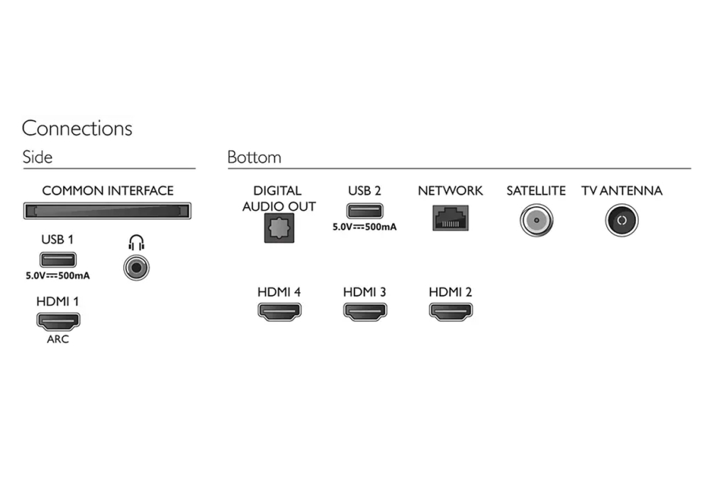 | Изводи за свързване | 4 HDMI, 2 USB, Satellite Connector, Common Interface Plus (CI+), Digital audio out (optical), Headphone out, Service connector |