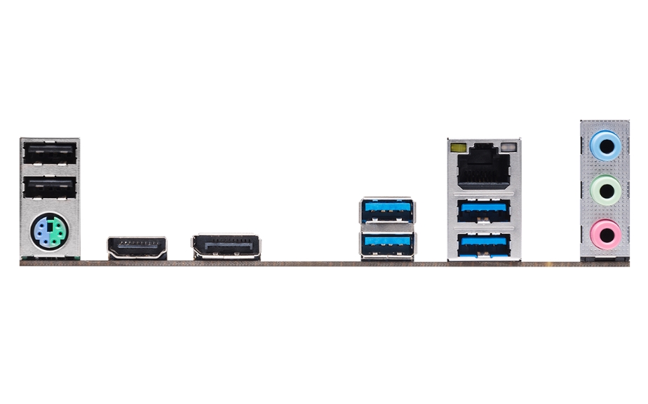 | Interface | 3 x Antenna Mounting Points; PS/2 Mouse/Keyboard Port; HDMI Port; DisplayPort 1.4; 4 x USB 3.2 Gen1 Ports; 2 x USB 2.0 Ports; RJ-45 LAN Port with LED; HD Audio Jacks: Line in / Front Speaker / Microphone |