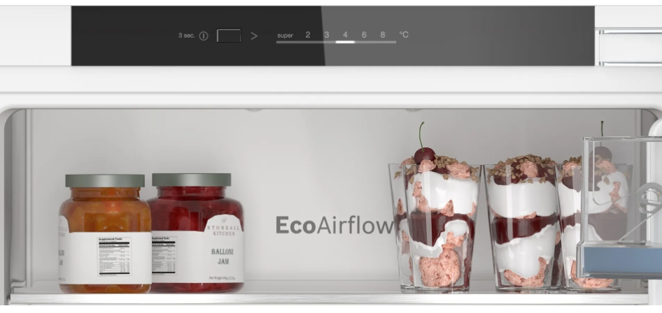 | Други | EcoAirflow, LED lighting; Super Cooling: automatic deactivation; MultiBox XXL: a huge drawer for your fruits and vegetables; 4 tempered glass shelves, 3 of which are height adjustable 1 large door holders 3 door holders, of which 1x butter/cheese |