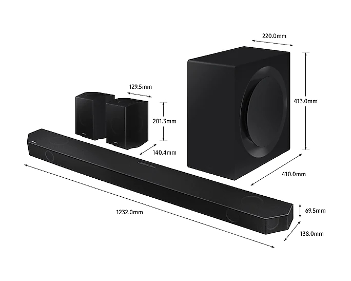 | Размери, mm | Net Dimension (Main Speaker) (WxHxD) 1232.0 x 69.5 x 138.0 mm; Net Dimension (Rear Speaker) (WxHxD) 129.5 x 201.3 x 140.4 mm; Net Dimension (Sub Woofer) (WxHxD) 220 x 413 x 410 mm |
