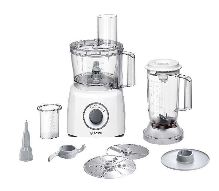 Кухненски робот, Bosch MCM3200W, Kitchen machine, MultiTalent 3, 800 W, BPA-free, plastic bowl 2.3 l , Double-sided stainless steel disc for cutting and planing, suitable for crushing ice, Dough attachment, white