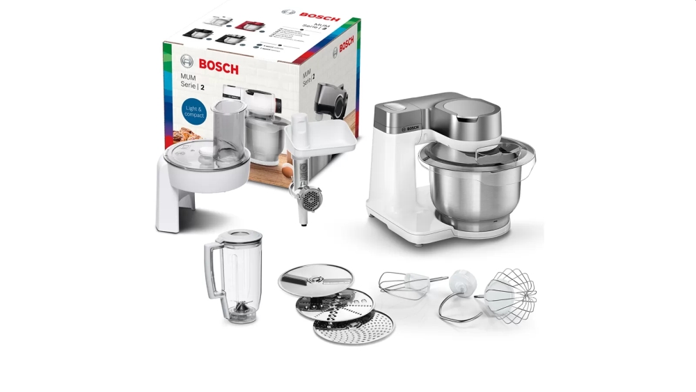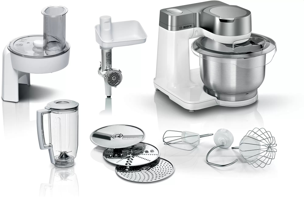 Кухненски робот, Bosch MUMS2VS30, Kitchen machine, MUM Serie 2, 900 W, 3.8L stainless steel bowl, 3D PlanetaryMixing, 7 speeds, Pastry set, 3 discs, Meat grinder, TR blender 1.25 l, Transparent lid with filling hole, White-Silver