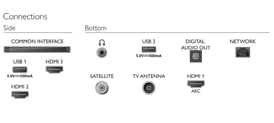 | Изводи за свързване | 3 HDMI, 2 USB, Satellite Connector, Common Interface Plus (CI+), Digital audio out (optical), Service connector, Headphone out |
