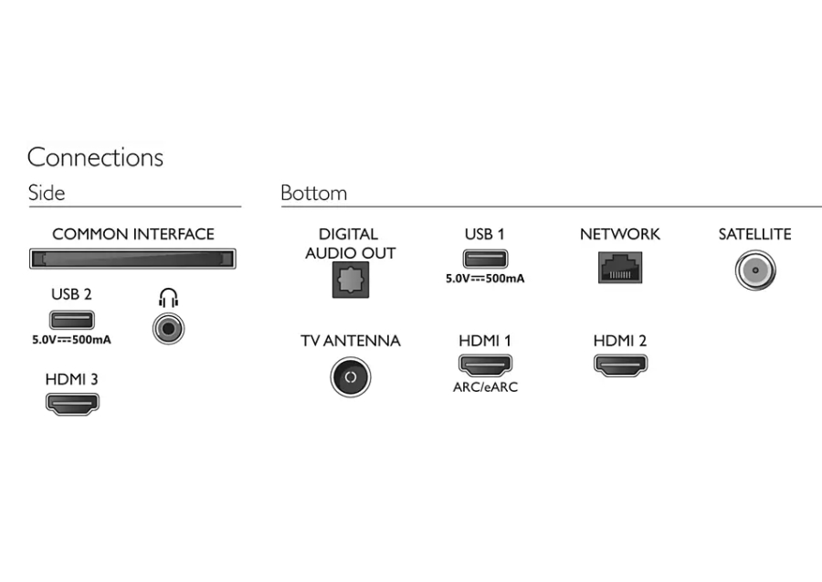 | Изводи за свързване | 3 HDMI, 2 USB, Satellite Connector, Common Interface Plus (CI+), Digital audio out (optical), Headphone out, Service connector |