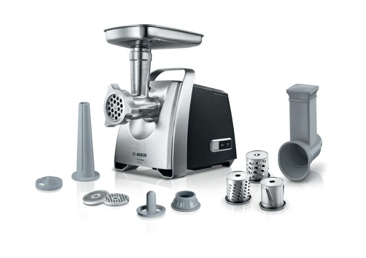 Месомелачка, Bosch MFW68640, Meat mincer, ProPower 2200 W, Discs: 3 / 4,8 / 8 mm, Sausage attachment, Kebbe attachment, Out: 4.3kg/min, Black, chrome