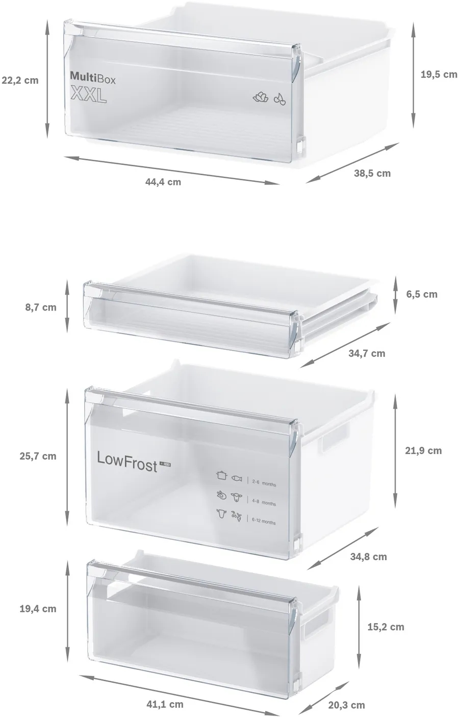 | Просторният хладилник с фризер LowFrost осигурява оптимално съхранение на храната и образуването на лед е значително намалено. Напомня ви, ако вратата не е затворена правилно или е възникнала друга грешка. Eco Airflow – оптимална циркулация на въздуха и постоянна температура в зоната за охлаждане. LED осветление: осветява хладилника равномерно без блясък, през целия жизнен цикъл на уреда. Чекмедже за замразена храна тип BigBox: за подреждане на контейнери за съхранение или за големи количества замразена храна. Автоматично супер замразяване: оптимално за замразяване на по-малко количество храна, като същевременно и предпазва замразените ви продукти от размразяване, благодарение на това, че открива повишаване на температурата и автоматично я понижава. |