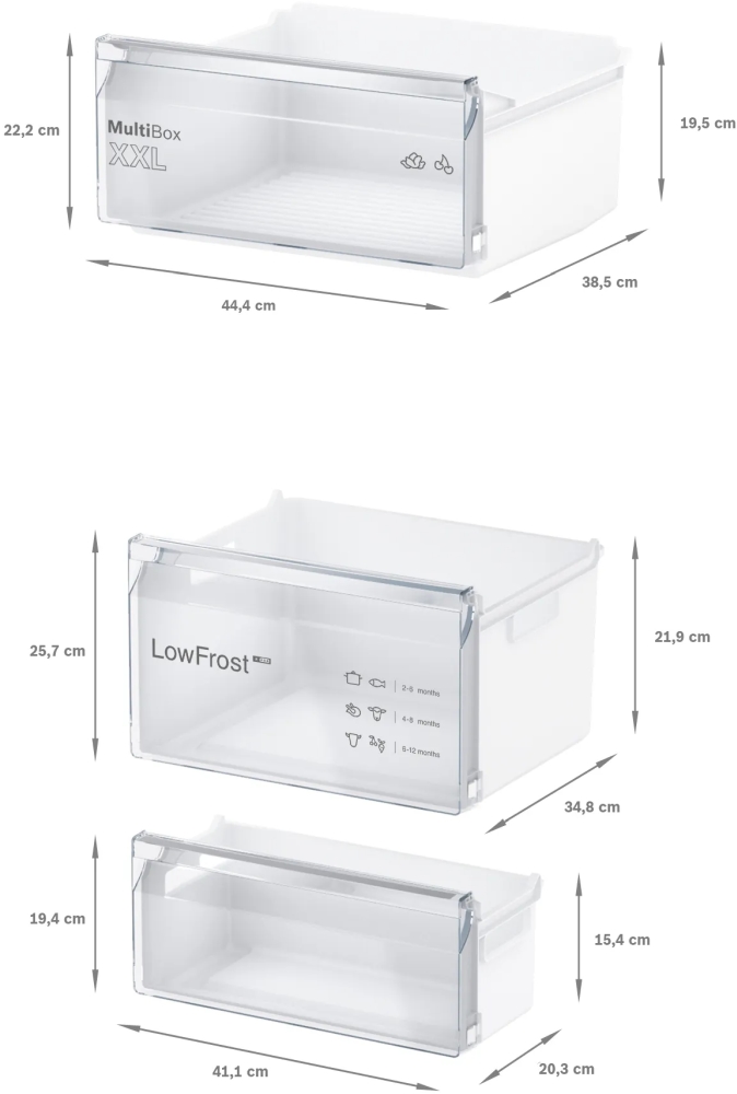 | Просторният хладилник с фризер LowFrost осигурява оптимално съхранение на храната и образуването на лед е значително намалено. Напомня ви, ако вратата не е затворена правилно или е възникнала друга грешка. Eco Airflow – оптимална циркулация на въздуха и постоянна температура в зоната за охлаждане. LED осветление: осветява хладилника равномерно без блясък, през целия жизнен цикъл на уреда. Чекмедже за замразена храна тип BigBox: за подреждане на контейнери за съхранение или за големи количества замразена храна. Автоматично супер замразяване: оптимално за замразяване на по-малко количество храна, като същевременно и предпазва замразените ви продукти от размразяване, благодарение на това, че открива повишаване на температурата и автоматично я понижава. |