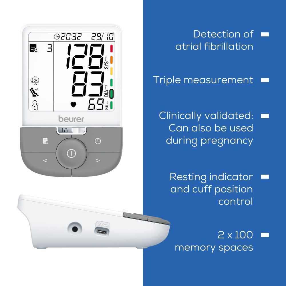 Апарат за кръвно налягане, Beurer BM 53 upper arm blood pressure monitor, 120 memory space, XL display with backlight, Detection of atrial fibrillation (AFIB), HSD, Risk indicator, USB-C connection, Arrhythmia detection, Cuff size from 22 - 42 cm, Storage bag