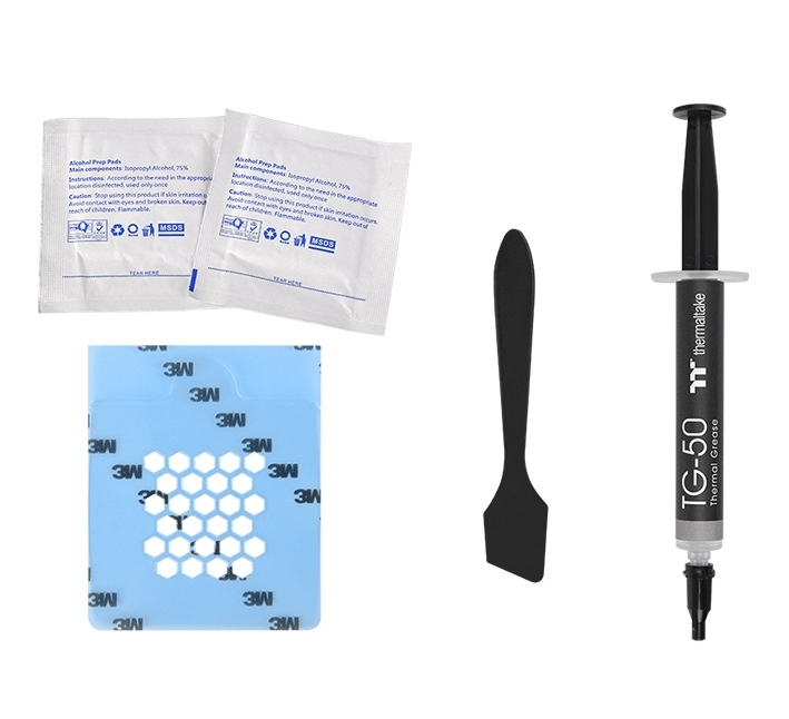 | Х-ка 7 | Thermaltake’s specially formulated thermal compound fits perfectly with the honeycomb stencil, which provides an easier way to apply your thermal compound for a neat and well-covered surface that fits all CPUs. |