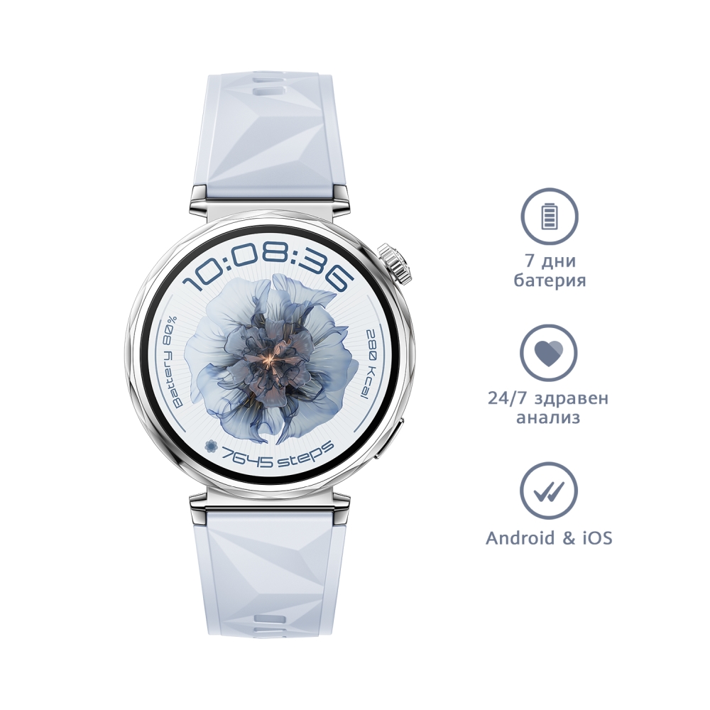 Часовник, Huawei Watch GT5 Jana-B19FC, 1.32", Amoled 466x466 PPI 352, , BT5.2 BLE/BR/EDR, 5ATM, 524mAh, Screenshot sharing, support message input, message notifications, Battery life up to 7 days,Compatible with iOS and Android devices, Blue Fluoroelastomer
