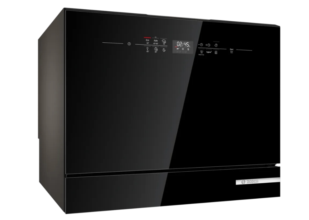 Съдомиялна, Bosch SKS6ITB00E, SER6, Compact dishwasher, E, Polinox, 8l, 6ps, 6p/5o, 49dB(C), full glass door black, 7-Segment Display, Touch Control, Hygiene+