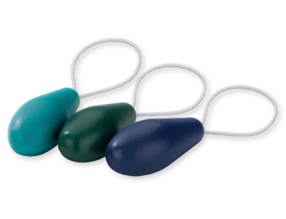 Х-ка 3 | Three identically sized tampon-shaped cones of different weights (turquoise: 28 g, fir green: 52 g, midnight blue: 71 g) |