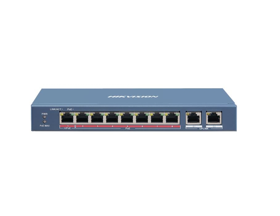Комутатор, HikVision 10 Port Fast Ethernet Unmanaged POE Switch, 8x 10/100 Mbps PoE port, 2x Gigabit RJ45 port, Power Budget 110W, Up to 300 m Long Range PoE Transmission