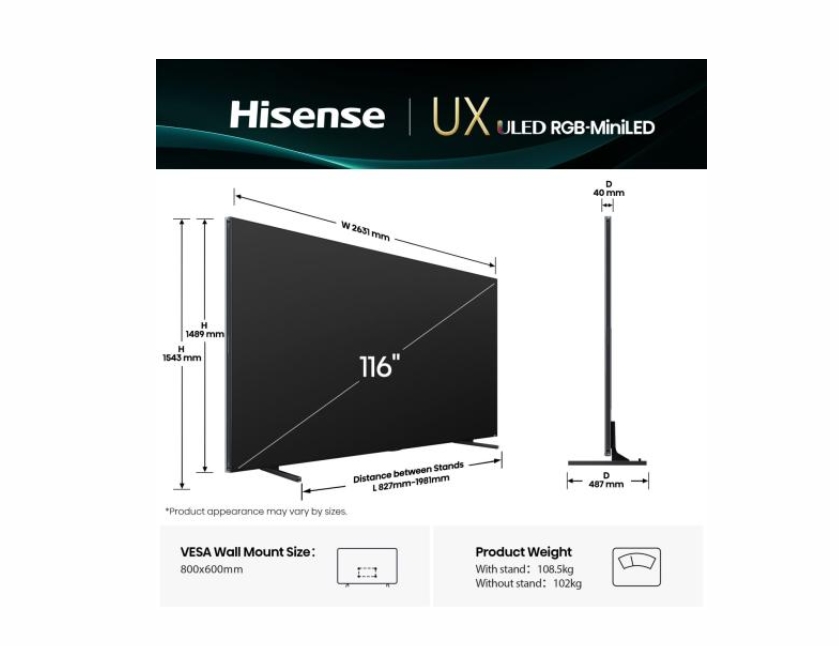 Телевизор, Hisense, 116'' UXQ,RGB Mini-LED, FALD, 165Hz, 3x4000 nits,Quantum Dot, Vidaa, ADS, Black