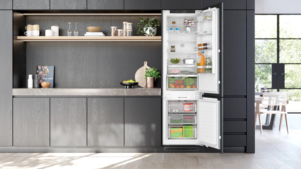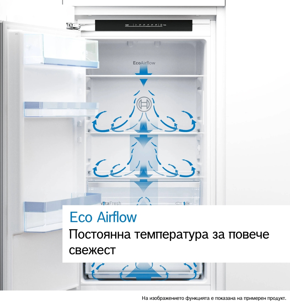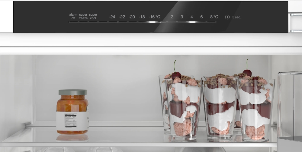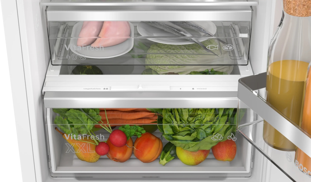 | Големият вграден хладилник с фризер с 11% повече охлаждащ обем, включително системата VitaFresh XXL <0°C>, No Frost и предупредителен сигнал за грешка за оптимално съхранение. Вграден XL обем: осигурете си 11%допълнително пространство за съхранение благодарение на по-високия дизайн. VitaFresh XXL <0°C>: хладилник, който запазва свежестта на храната по-дълго благодарение на по-големите чекмеджета с гъвкав контрол на температурата. Eco Airflow – оптимална циркулация на въздуха и постоянна температура в зоната за охлаждане. Аларма за отворена врата: Напомня ви, ако вратата не е затворена правилно. Freezer Light: Ярко осветление във вашия фризер. |
