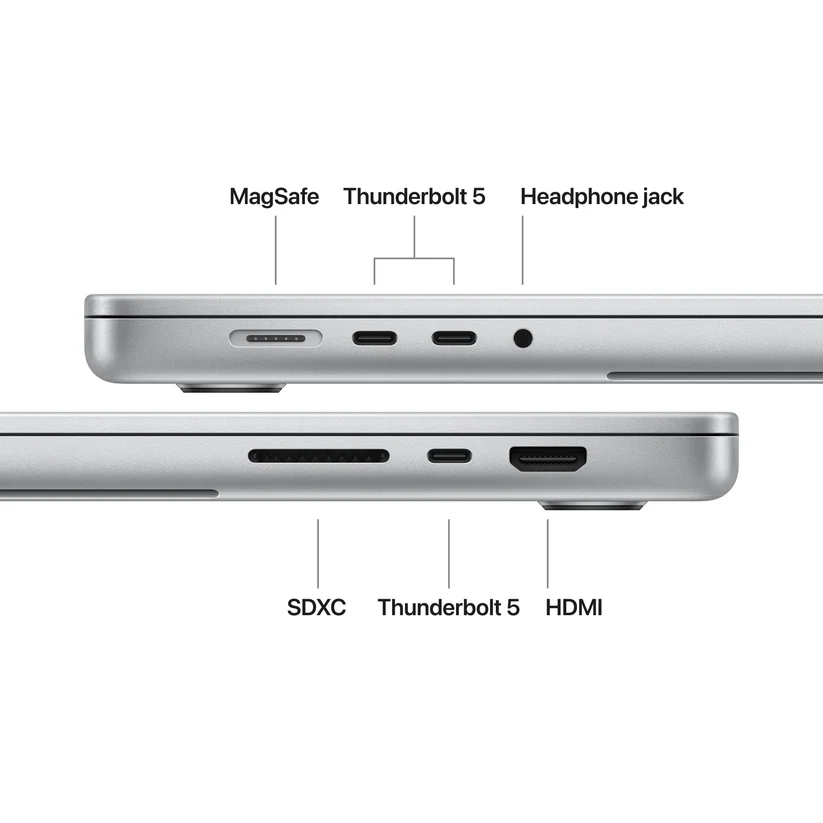 | Разширителен порт | 3 Thunderbolt 4 (USB-C) ports with support for: Charging, DisplayPort, Thunderbolt 5 (up to 120Gb/s), USB 4 (up to 120Gb/s); MagSafe 3 port |