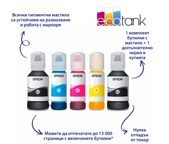 | Консумативи | 112 EcoTank Pigment Black ink bottle (Up to 7500 pages); 112 EcoTank Pigment Cyan/Magenta/Yellow ink bottles (Up to 6000 pages each color) |