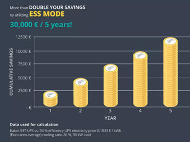 Фокусираните върху ефективността технологии на Eaton ви помагат да намалите значително разходите си за закупуване и работа. Eaton 93T UPS предлага повече от 96% онлайн ефективност и се изплаща за 3 години. Системата за съхранение на енергия (ESS) подобрява нивата на ефективност до 99%. ESS е най-доказаната и надеждна енергоспестяваща система на пазара с многогодишна употреба в рамките на широка инсталационна база.