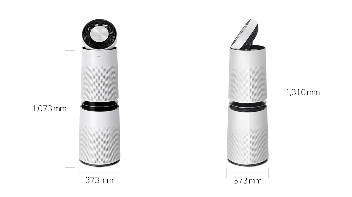 LG PuriCare™ е доста голямо устройство, но е проектирано достатъчно добре, за да се слее с обстановката на дома Ви. Всъщност цилиндричното тяло с въртяща се глава може лесно да мине като футуристичен декоративен елемент вместо уред. По височина в уреда се помещават два независими филтъра и въртящ се бустер вентилатор.