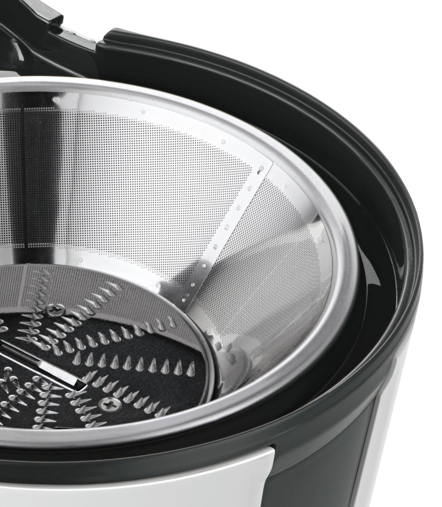 | Мощната сокоизстисквачка работи с цели плодове без необходимост от предварително рязане: бързо, лесно и чисто. SafetyStop осигурява ефикасна защита срещу нараняване: Когато отваряте капака по време на работа, двигателят незабавно и автоматично спира за секунди. Уредът може да бъде включен само ако всички части са правилно сглобени. Голям отвор за пълнене за плодове (цели ябълки) и зеленчуци – без нужда от предварително рязане. Микроцедка от неръждаема стомана за оптимално извличане на сок. Практичен чучур с DripStop предотвратява капане и осигурява чиста работна площ. Практично използване с две скорости за твърди и меки плодове. |