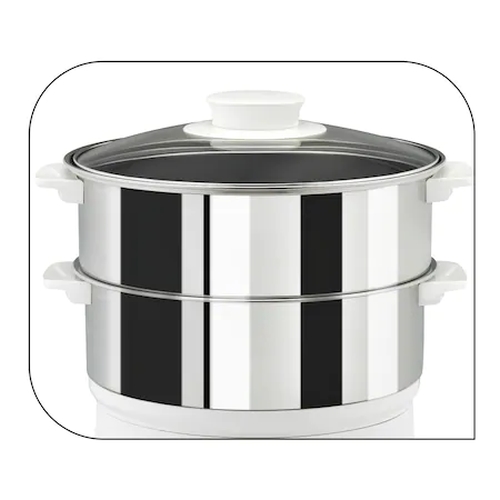 | Kупите могат да се съхраняват обърнати обратно върху основата, което позволява компактното му съхранение. Таймерът с автоматично изключване ви осигурява лесна употреба. Нивото на водата е винаги видимо и лесно можете да доливате по време на готвене. 60 минутен механичен таймер със звуков сигнал ви съобщава кога храната е готова. Видим индикатор за нивото на водата 2 купи, които могат да се съхраняват една върху друга, с капацитет 6 литра. |
