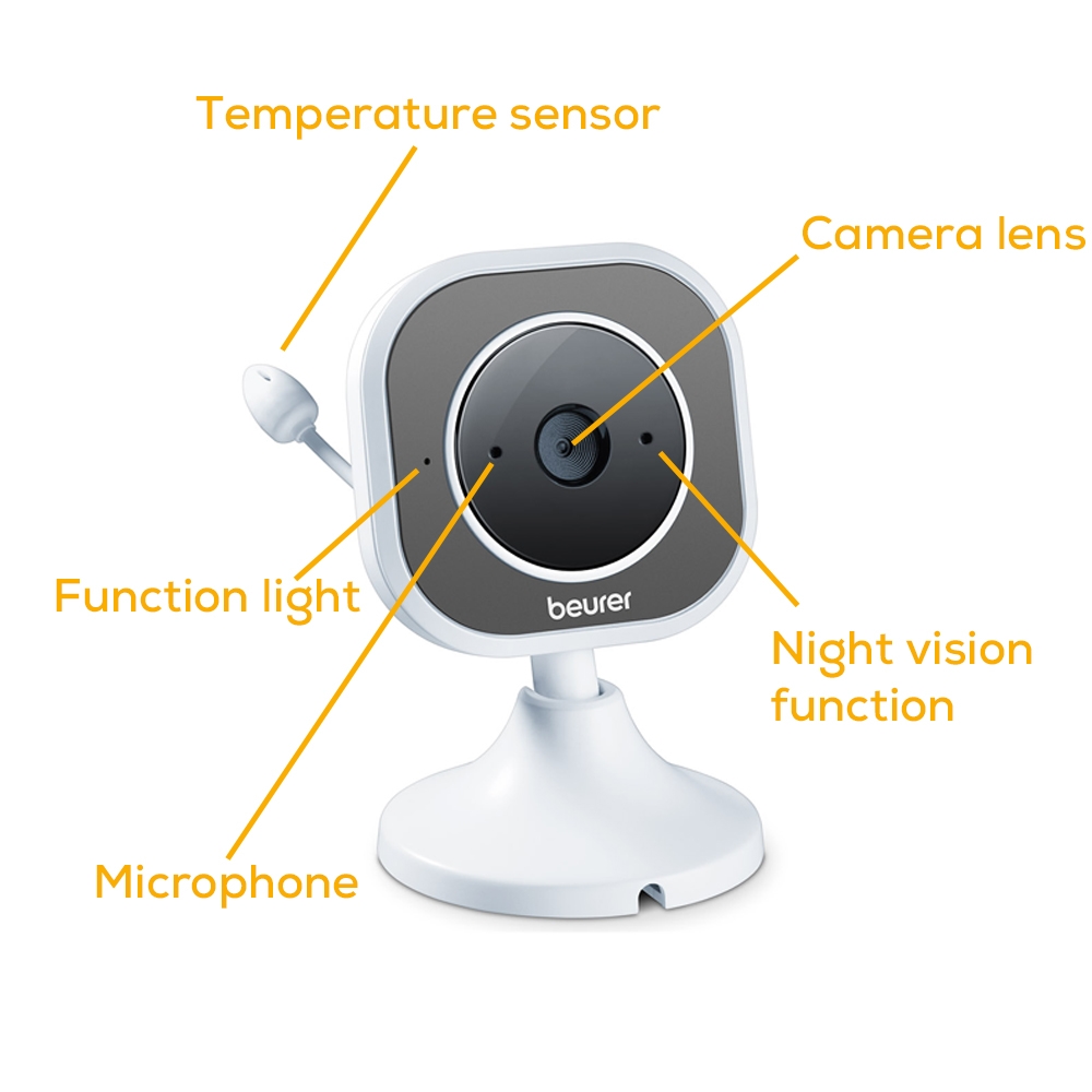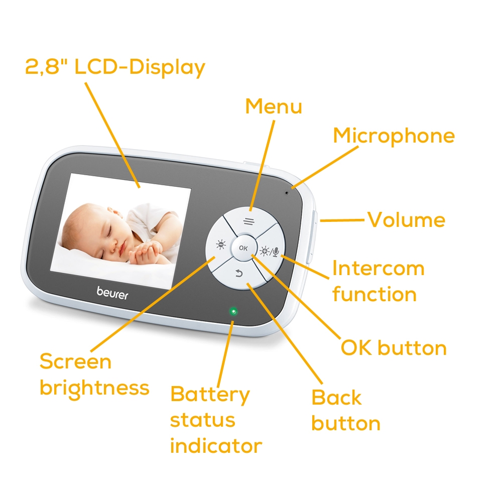 Baby monitor, Beurer BY 110 video baby monitor, 2.8" LCD colour display,infrared night vision function,4 gentle lullabies,Intercom function,Motion and sound alarm,Range of up to 300 m,The monitor is compatible with up to 4 cameras