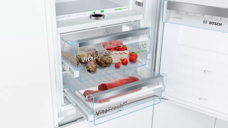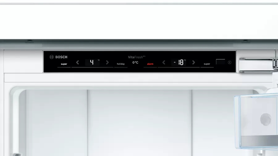 | VitaFresh pro: храната се запазва свежа до три пъти по-дълго благодарение на технология за поддържане на 0 °C и оптимална влажност на въздуха. LED осветление: осветява хладилника равномерно без блясък, през целия жизнен цикъл на уреда. VarioZone: повече гъвкавост благодарение на стъклени полици с разнообразно приложение и чекмеджета във фризерната част. Автоматично супер замразяване: оптимално за замразяване на по-малко количество храна, като същевременно и предпазва замразените ви продукти от размразяване, благодарение на това, че открива повишаване на температурата и автоматично я понижава. NoFrost: никога повече няма да размразявате благодарение на перфектната защита срещу образуване на лед - така пестите време и усилия. Предупредителен сигнал със звук или светлина, когато вратата не е затворена или когато се получи друга грешка. Сензорите FreshSense постоянно следят и контролират околната температурата, както и температурите в хладилната и фризерна част. Резултатът е постоянна температура вътре в хладилника, независимо от температурата навън. Когато функцията Почивка е активирана, температурата в хладилната секция е прибл. + 14°C а във фризера - прибл. -18°C, като по този начин се предпазва замразената храна и се предотвратява ненужния разход на енергия в хладилника. |