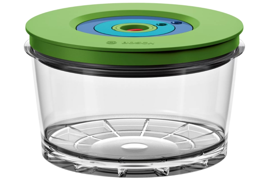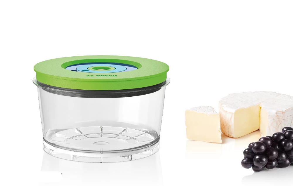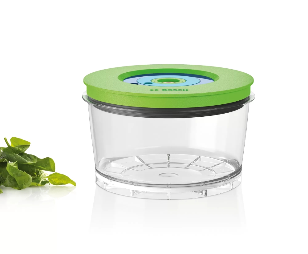 | Удобна вакуумираща кутия за по-дълго съхраняване. Задържа свежестта: създава херметично уплътнение, за да запази храната и да я държи свежа във вашия хладилник, фризер или килер. Изключително здрави-направени от Тритан, без BPA: устойчиви на счупване, не задържат миризми и не се оцветяват, могат да се почистват в съдомиялна машина. Съвместим клапан за вакуумно уплътняване: Издръжлив материал, отговарящ перфектно на високопроизводителната електрическа вакуум помпа на вакуумния блендер Bosch VitaMaxx. Части без бисфенол А (BPA): Здравословно, безопасно и удобно приготвяне на вашите ястия. 1 практична вакуумна кутия: запазете храните и напитките свежи до 2 пъти по-дълго, отколкото без вакуум. Удобна функция за настройване на датата: може да въведете ден и месец за съхранение като завъртите колелцето на капака. |