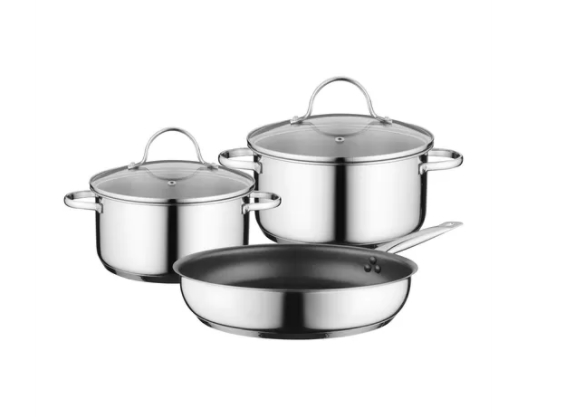 | Комплект от 2 тенджери и 1 тиган: една Ф 14/16 cm, втора Ф 18/20 cm, тиган Ф 22/26 cm. Подходящи за индукционни плотове. Висококачествена неръждаема стомана. Подходящи за съдомиялна машина. |