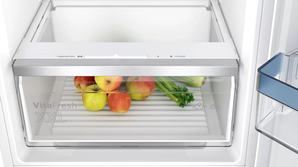 | Просторната вградена комбинация от хладилник с фризер и VitaFresh XXL поддържа храната по-дълго свежа. Вашите богати на витамини плодове и зеленчуци остават свежи за по-дълго време в отделение с допълнително пространство и контрол на климата. Поддържа оптимална циркулация на въздуха и гарантира постоянно ниво на температурата в зоната на охлаждане. Предлага повече пространство и стабилност благодарение на изключително гъвкавите рафтове на вратите. LED осветление: осветява хладилника равномерно без блясък, през целия жизнен цикъл на уреда. LowFrost: по-рядко размразяване благодарение на по-слабото образуване на лед - спестява работа и е енергоефективно. |