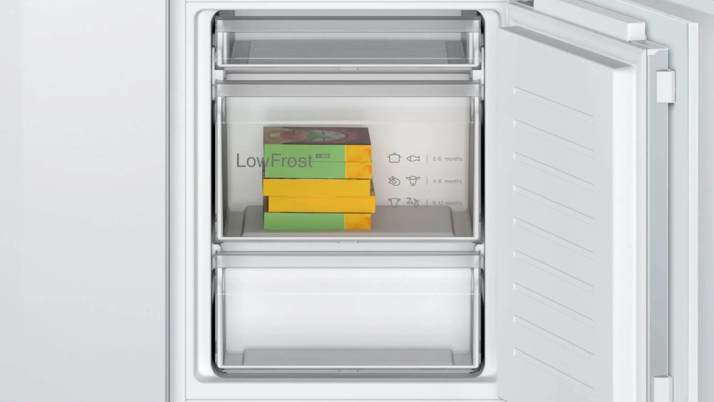| Просторната вградена комбинация от хладилник с фризер и VitaFresh XXL поддържа храната по-дълго свежа. LED осветление: осветява хладилника равномерно без блясък, през целия жизнен цикъл на уреда. LowFrost: по-рядко размразяване благодарение на по-слабото образуване на лед - спестява работа и е енергоефективно. Много място за големи замразени стоки, умело съчетани с допълнителна вътрешна кутия за по-малки предмети. Вашите богати на витамини плодове и зеленчуци остават свежи за по-дълго време в отделение с допълнително пространство и контрол на климата. |