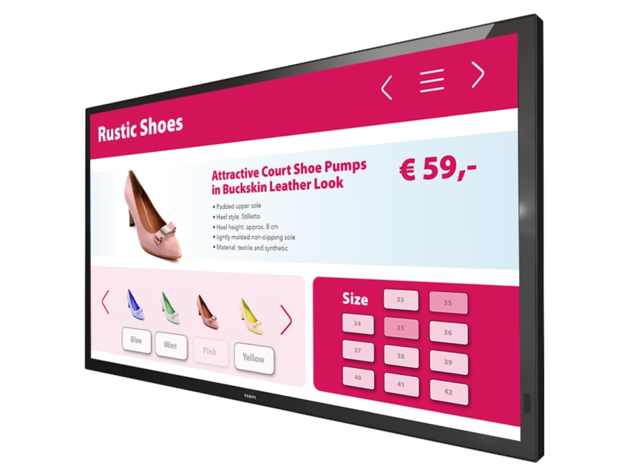 | Other | Bezel width: 2.0 mm; Display colors: 1.07 Billion; Smart Power, Failover; Internal Player - CPU: 2x A53, 2x A73; GPU: ARM Mali G51; Memory: 2 GB DDR3, Storage: 8 GB; CE, CB, BSMI, FCC Class A, CU, ETL, IMDA, PSB, RoHS |