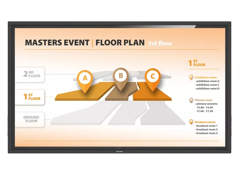 | Вдъхновете сътрудничество. Предоставяйте информация. Този бързо реагиращ Multi-Touch професионален UHD дисплей на Philips е идеален за приложения с докосване от няколко пръста или потребители – от ориентиране до презентации. До 20 точки на докосване могат да бъдат активни едновременно. Стартирайте мрежата си от дисплеи чрез локална (LAN) връзка. CMND & Control ви позволява да изпълнявате важни функции, като например контролиране на входовете и наблюдение на състоянието на дисплея. Независимо дали отговаряте за един екран или 100. От чакалнята до заседателната зала никога не показвайте празен екран. FailOver позволява вашият професионален дисплей Philips автоматично да превключва между първични и вторични входове, като гарантира, че съдържанието продължава да се възпроизвежда дори при липса на главния източник. Просто задайте списък с алтернативни входове, за да сте сигурни, че вашият бизнес е винаги достъпен. Управлявайте дисплея чрез интернет връзка. Професионалните дисплеи с Android на Philips са оптимизирани за стандартните приложения на Android и можете да инсталирате уеб приложения директно на дисплея. Нов Android 8 гарантира, че софтуерът е сигурен и остава до най-новите спецификации по-дълго. |