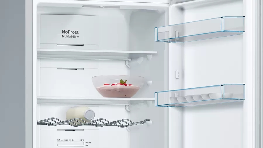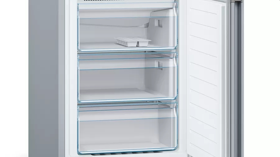 | Свободностоящ хладилник с долен фризер. VitaFresh: запазва храната свежа за по-дълго в чекмеджета с контролиран климат при почти 0°C. PerfectFit: поставете хладилника си плътно до стени и други уреди, за да спестите място. LED осветление: осветява хладилника равномерно без блясък, през целия жизнен цикъл на уреда. Автоматично супер замразяване: оптимално за замразяване на по-малко количество храна, като същевременно и предпазва замразените ви продукти от размразяване, благодарение на това, че открива повишаване на температурата и автоматично я понижава. Полица EasyAccess: изтеглящ се стъклен рафт за още по-лесен достъп до продуктите в хладилника. |